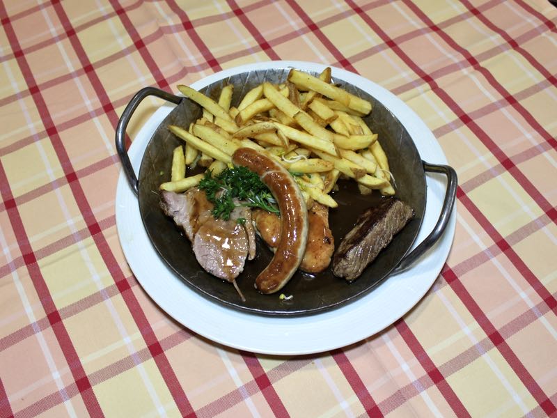 | Feinschmeckerpfännle 25,90 € Rinder- und Puten-Medaillons, Schweinebraten, Grillwurst, mit Pommes frites und Bratensauce |