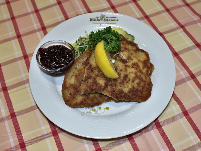 | Original Wiener Schnitzel – kleine Portion 20,90 € vom Bayrischen Kalb, mit Kartoffel-Gurken-Salat und Preiselbeeren |