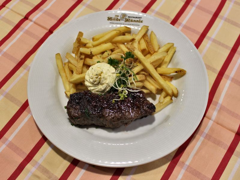 | Steak vom heimischen Weiderind 27,50 € mit Pommes frites und hausgemachter Kräuterbutter |