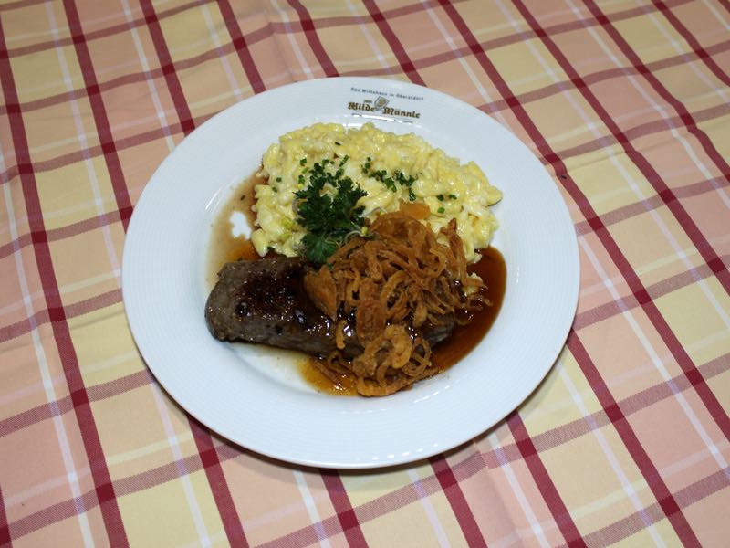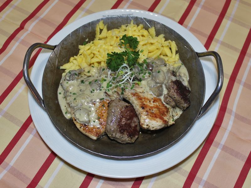 | Wilde-Männle-Pfännle 26,50 € mit je 2 Rinder- und Puten-Medaillons, Butterspätzle und Pilzrahmsauce kleine Portion 20,00 € |