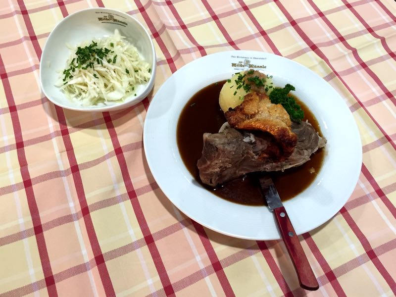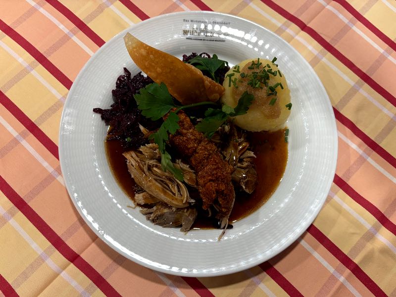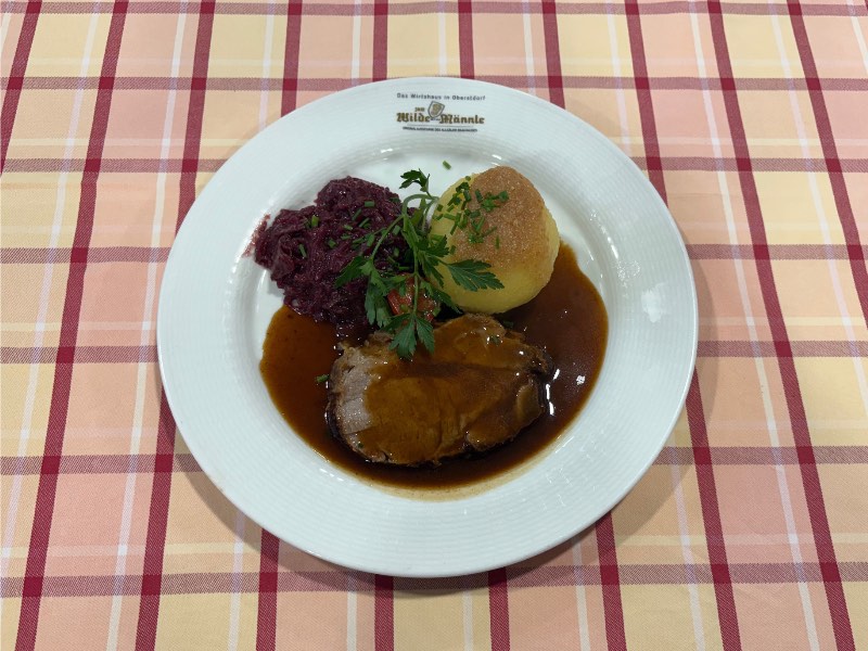 | Ofenfrischer Schweinsbraten – kleine Portion 13,50 € mit Dunkelbiersauce, dazu Kartoffelknödel und Blaukraut |