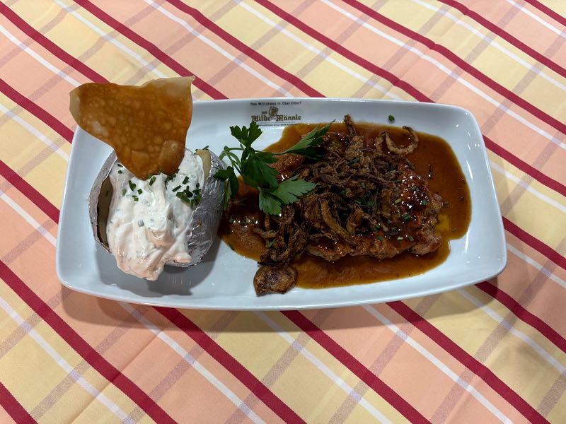| Holzfällersteak 16,90 vom Schweinenacken an Dunkelbiersauce, mit Röstzwiebeln und Folien-Ofenkartoffel mit Kräuterquark |