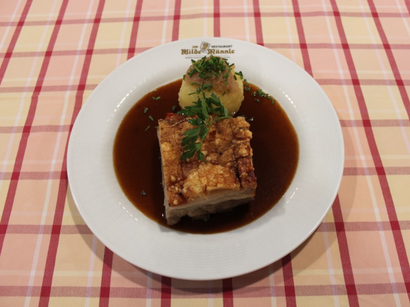 | Krustenbraten 17,50 € vom Schweinebauch, mit Dunkelbiersauce und Kartoffelknödel |