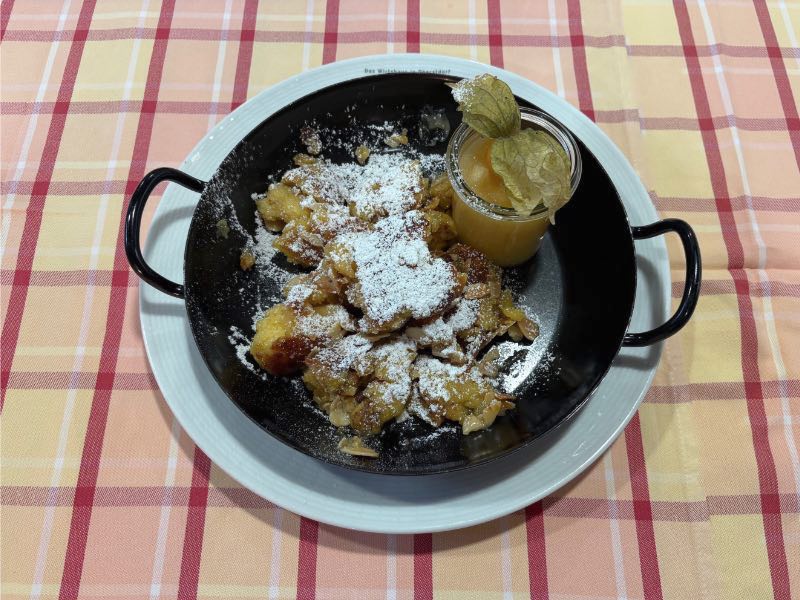 | Homemade Kaiserschmarren – small portion 10,90 € with almonds and applesauce |